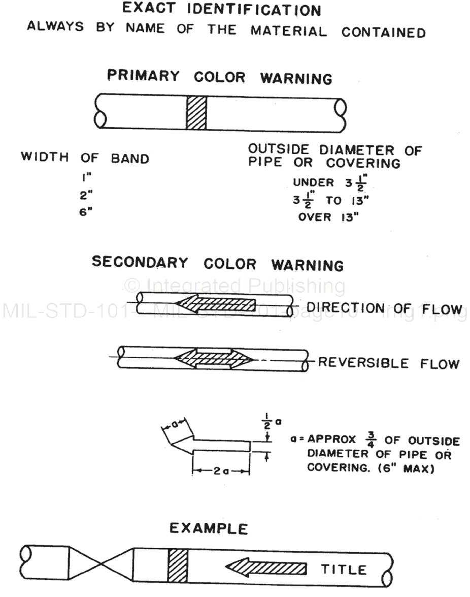 MIL-STD-101 Color Code For Pipelines And For Compressed Gas CylindersThis standard establishes a common color code for visual warnings to accompany the written identification of materials covered in piping systems and contained in compressed gas cylinders, and to facilitate the segregation of these cylinders at depots. This standard does not define the manner or conditions under which these materials may be used safely.